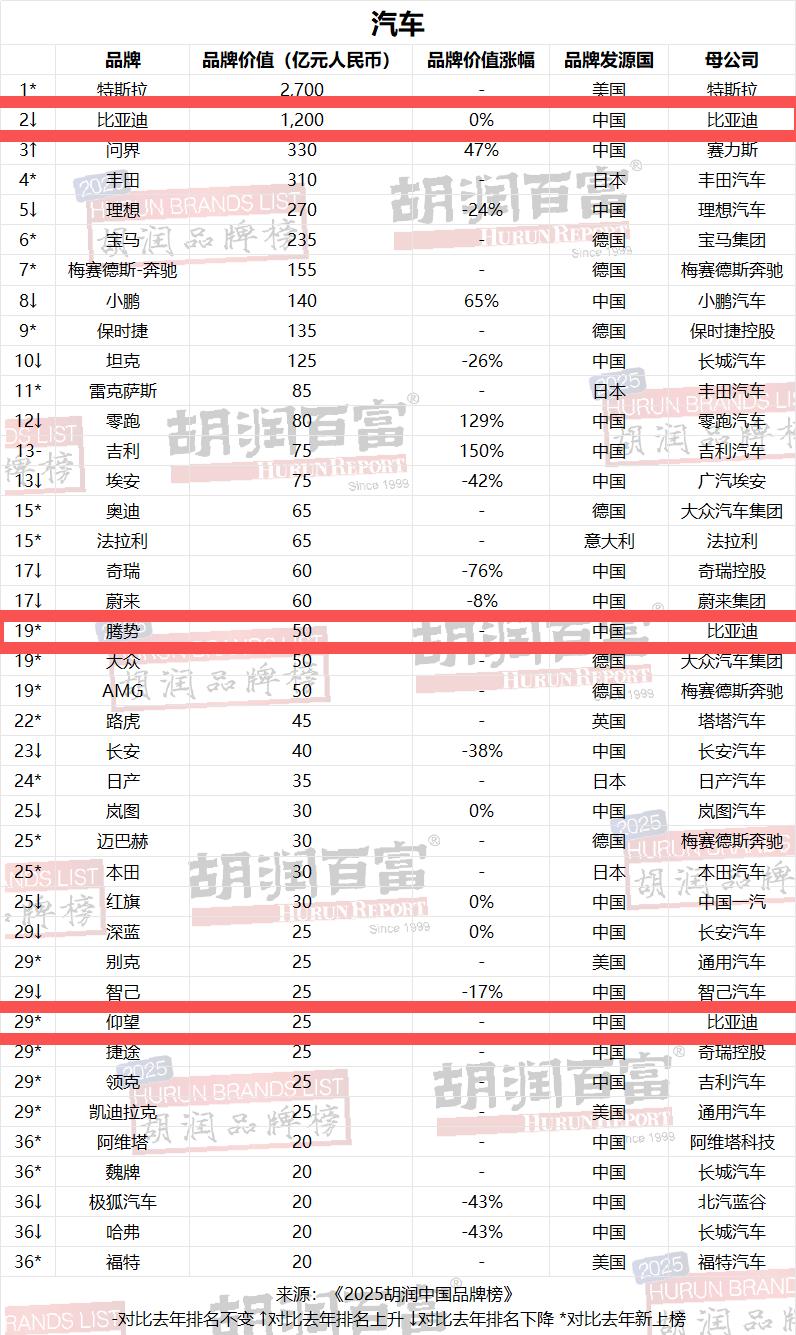 2月3日,规则调整后的2025胡润汽车品牌榜出炉。榜单显示,比亚迪以1200亿元品牌价值连续四年蝉联中国汽车品牌第一名。