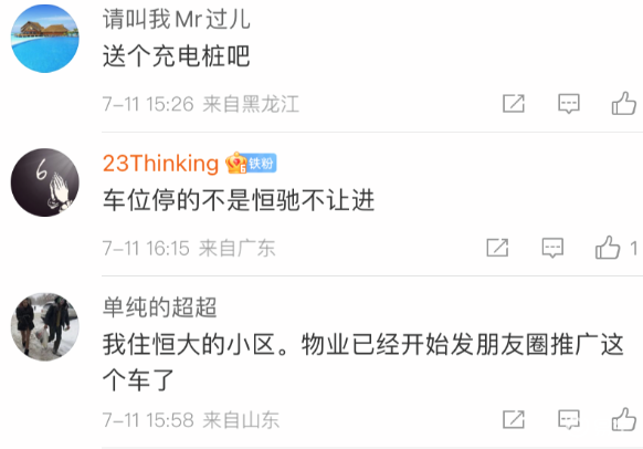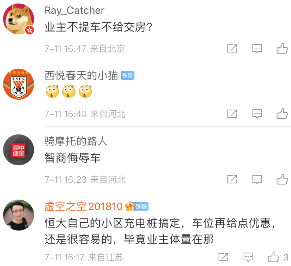 有网友在社交媒体的评论区说不买恒驰5不让进恒大小区地库,说实话这有点扯淡了,属于闹笑话的类型,相信恒大应该不会做出这样的事情。不过有一些网友的分析貌似有几分可信度,比如说买了恒驰5可以享受专属充电桩,或者充电优惠,甚至不排除免租几个月的车位,反正房地产公司玩儿这些早就轻车熟路了。