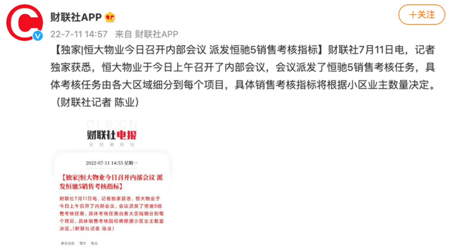 来看财联社报道信息,7月11日恒大集团组织物业板块及汽车板块相关高管开会,会议派发了恒驰5销售考核任务,具体考核任务由各大区域细分到每个项目,具体销售考核指标将根据小区业主数量决定。