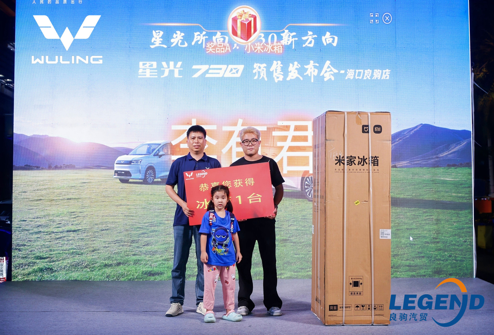 车辆品鉴环节成为活动高潮,嘉宾们纷纷走进体验区近距离感受星光 730 的空间布局与细节设计,胡桃棕与暖沙棕双色内饰、41 处声学包营造的静谧座舱、25 处人性化储物空间等亮点获得一致好评。主持人实时播报的订单情况更是持续点燃现场热情,每一次订单更新都引发阵阵掌声。两轮互动摇一摇游戏让氛围愈发火爆,最终抽奖环节中,现场订车客户专属的终极大奖 —— 冰箱一台由李先生幸运抽中,五菱领导登台颁奖并合影留念,定格这一欢乐时刻·。