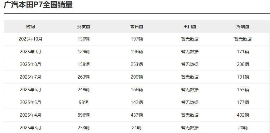 本田25年前三季度销量22.39万辆,同比下滑27.58%,且自3月起连续7个月出现同比下滑,主力车型雅阁、CR-V年销降幅超25%。今年推出的P7车型在上市后就进入低迷期,5月-10月,单月销量基本维持在200辆上下。