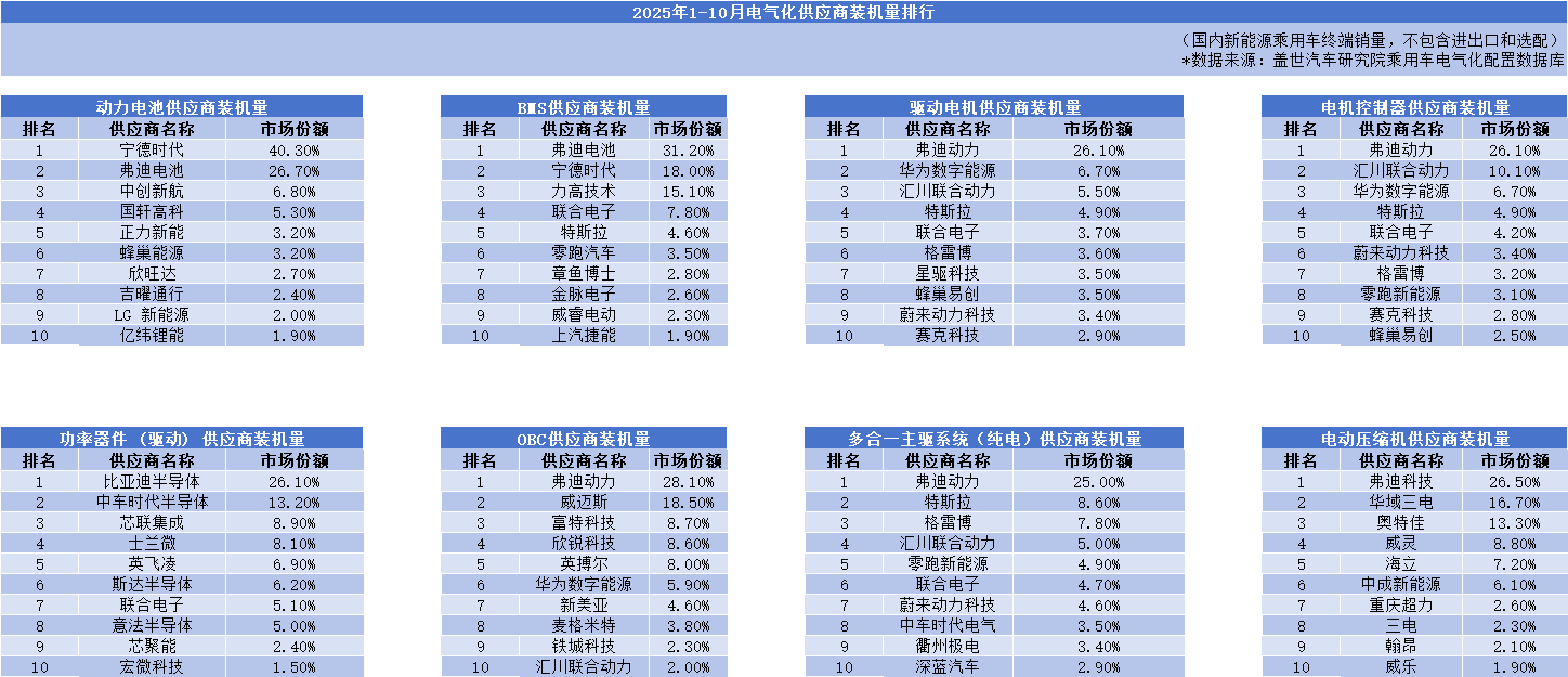 根据盖世汽车发布的2025年1-10月电气化供应商装机量排行数据,比亚迪旗下的弗迪电池、弗迪动力等子公司,在动力电池、驱动电机、电控系统等核心零部件的装机量榜单上,几乎都稳居榜首,充分彰显了比亚迪作为行业顶级核心零部件供应商的综合实力。