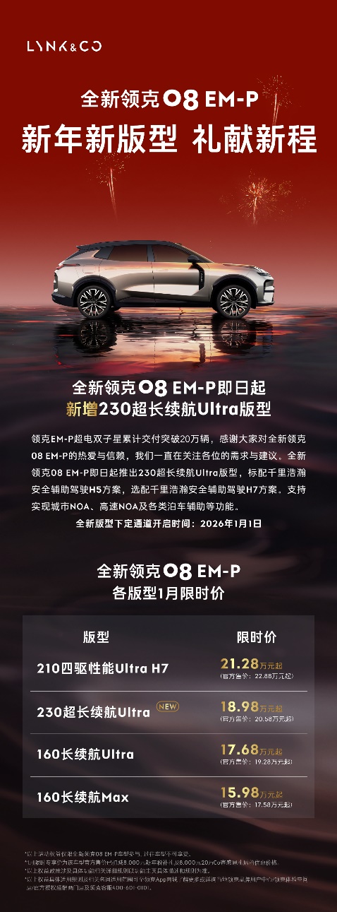 领克一直持续关注用户的需求和建议。为了响应用户对于辅助驾驶的不同需求,于2026年1月1日,增加230超长续航Ultra版型,1月限时价18.98万元起。该版型标配千里浩瀚H5安全辅助驾驶系统,可选配千里浩瀚H7安全辅助驾驶系统。从1月1日起,新增的230超长续航Ultra版型已经开启下定通道。该版型交付即可使用高速NOA、城市NOA及多场景泊车功能,为用户提供更灵活的辅助驾驶方案选择。