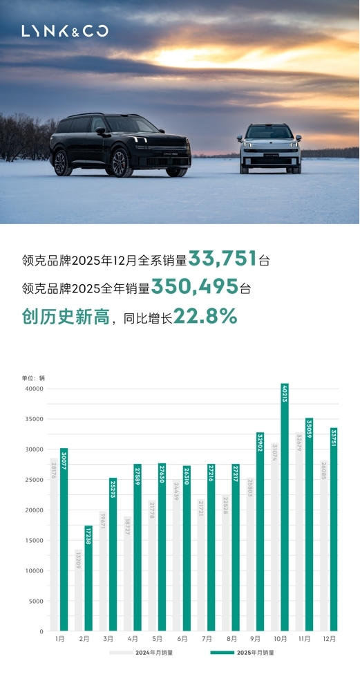 2026年1月1日,领克对外公布2025年12月销量为33,751台,2025年全年累计销量达350,495台,同比增长22.8%。自2017年首款车型投放以来,领克历史累计销量超过168万台,品牌市占率稳步提升,在充满挑战的市场环境中,展现出极强的发展韧性与增长潜力。